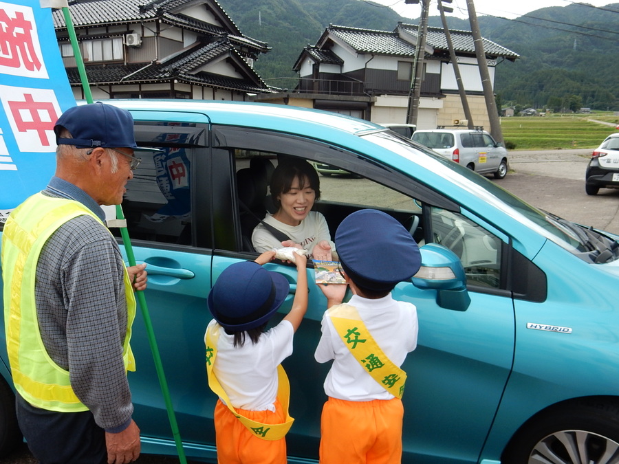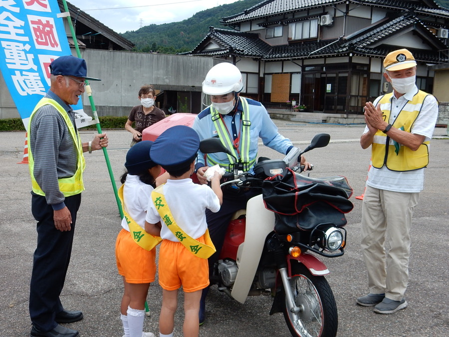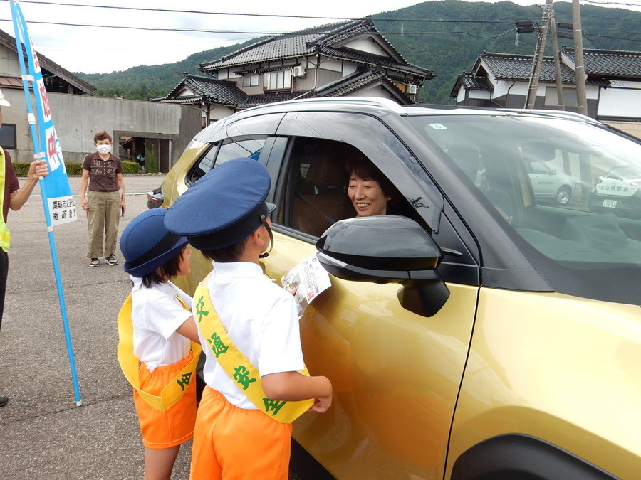 県道井波城端線から誘導された車両のドライバーさんに、子どもたちが「新米(しんまい)」の入った小袋と「シートベルト着用のリーフレット」を手渡します💞 「安全運転してください!」その元気なかけ声に、ドライバーさんたちも笑顔・笑顔☺️☺️☺️