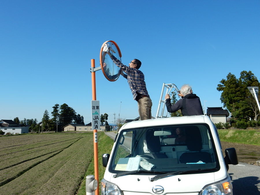 地区内に点在する26か所のカーブミラーを、南砺市交通安全協会井波支部南山見分会の役員の皆さんが、2班に分かれて実施🪜🪣